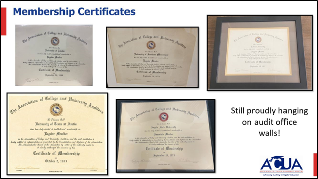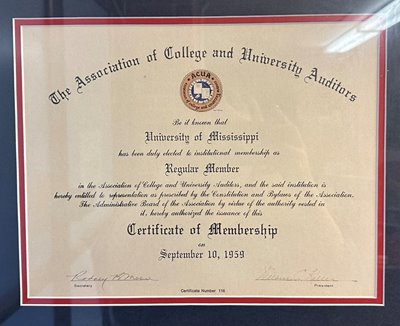 The search was on for the oldest certificate. The University of Washington thought their September 6, 1961, certificate was the oldest until Tanya Satterfield at the University of Mississippi shared their certificate dating back to September 10, 1959, just one year after ACUA was founded. Tanya and her colleagues proudly displayed the certificate at the 2023 AuditCon in Miami.